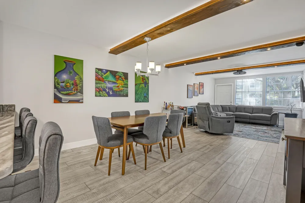 Welcome to this beautifully updated, light-filled corner unit with thoughtful upgrades throughout. High ceilings with exposed beams feature indirect LED cove lighting and recessed lighting, creating a warm, modern ambiance. The updated kitchen offers stainless steel appliances, granite countertops, and a spacious island, perfect for everyday living and entertaining. A split-bedroom floor plan provides added privacy, while luxury vinyl flooring runs throughout for a clean, cohesive look. The primary suite features an updated shower with bench, quartz countertops, and an LED mirror. The guest bathroom has been tastefully updated with a modern tile surround and quartz countertops. Major improvements include a new roof (2025), A/C only a few years old, and all air ducts and dryer ducts replaced. Ideally located near the front of this quiet, well-maintained community and just steps from the association pool, with shopping and dining nearby, this move-in-ready condo is easy to love.
